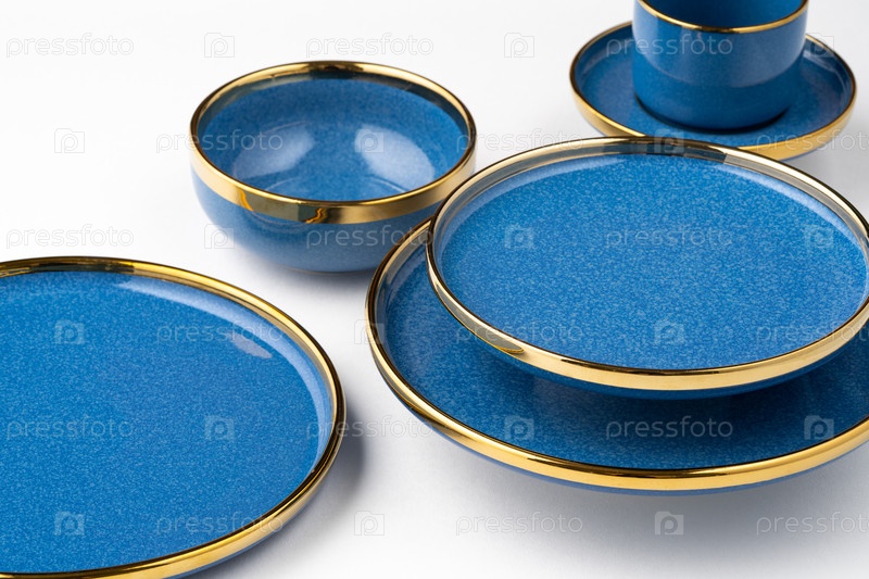 Набор синих керамических тарелок и чашки на белом фоне