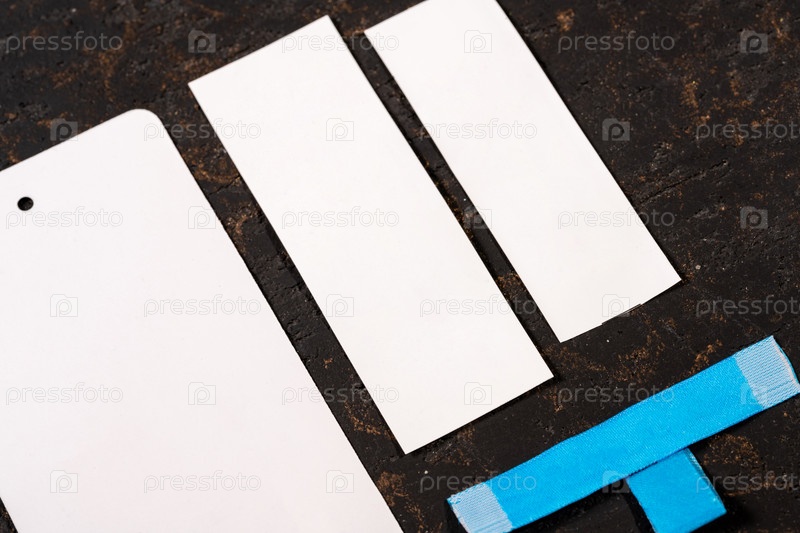 Крупный план пустых синих и белых бумажных бирок для продажи одежды