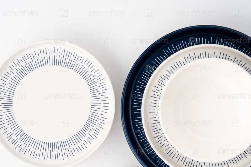 Набор сине-белой роскошной керамической кухонной утвари на белом фоне