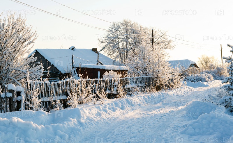 Зимняя деревенская дорога и деревья в снегу