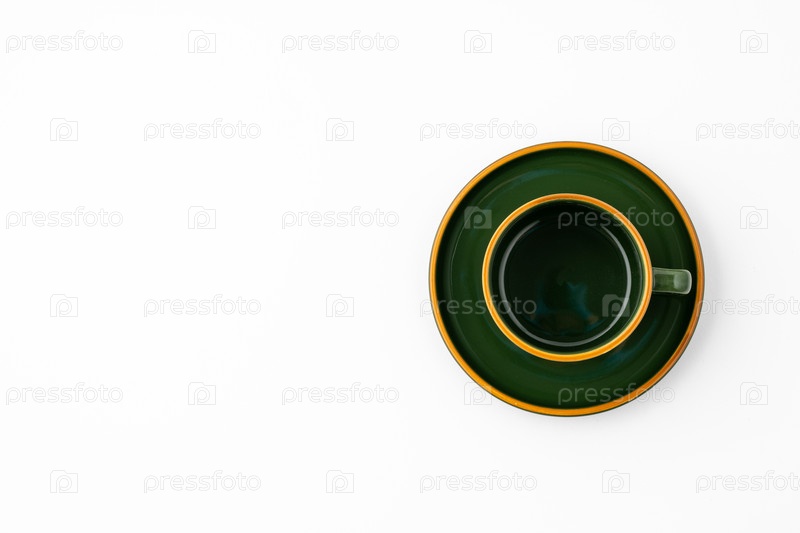 Набор зеленой керамической тарелки и кофейной кружки на белом фоне