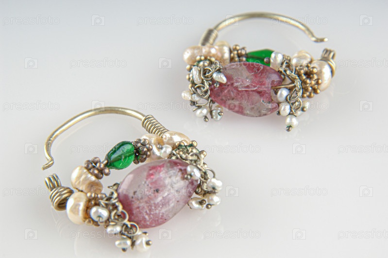 Винтажные серьги из Центральной Азии с драгоценными камнями на белом фоне