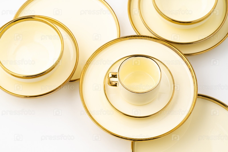 Набор золотой роскошной керамической кухонной утвари на белом фоне