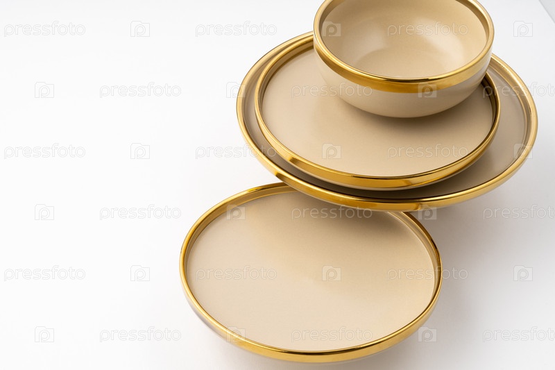 Набор светло-коричневой керамической тарелки и миски на белом фоне