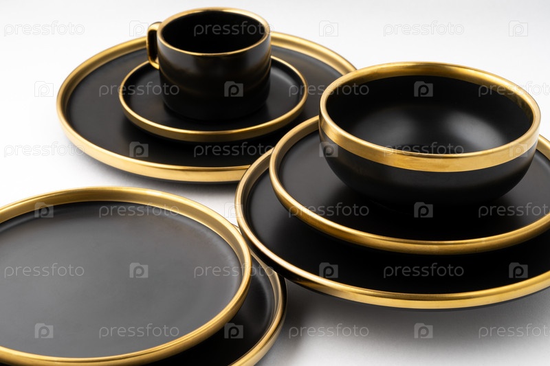 Набор черных и золотых керамических тарелок и чашки на белом фоне