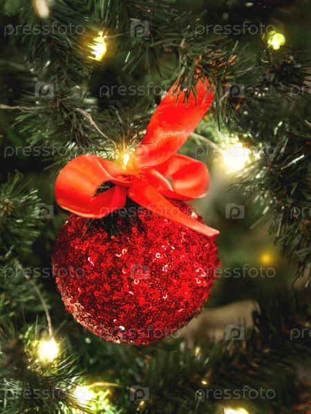 Рождественская елка с блестящими украшениями. Ель, украшенная ярко-красным стеклянным шаром с бантом и блестками для празднования Нового года