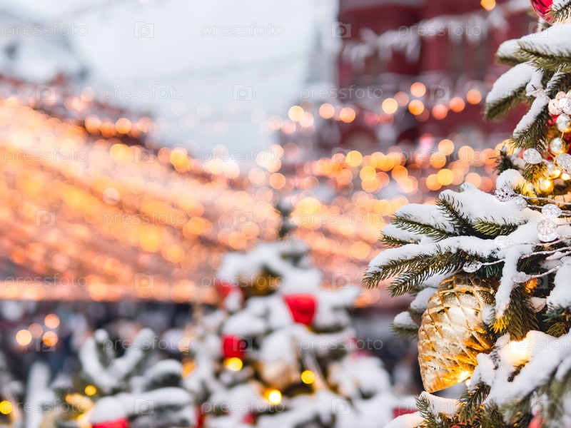 Рождественская елка с красочными уличными украшениями. Ель, украшенная лампочками и золотыми сосновыми шишками для празднования Нового года