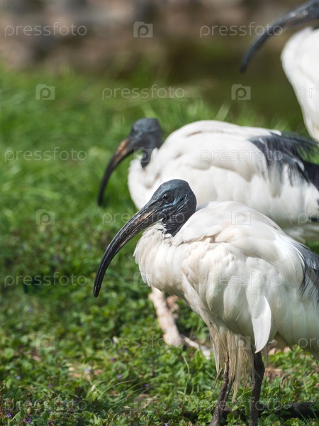Портрет африканского священного ибиса или Threskiornis aethiopicus, стоящего в зеленой траве