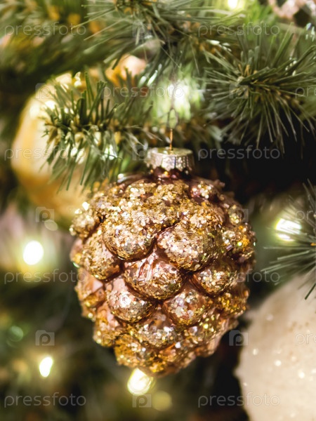 Рождественская елка с блестящими винтажными украшениями. Ель, украшенная лампочками, ретро сосновая шишка с блестками для празднования Нового года