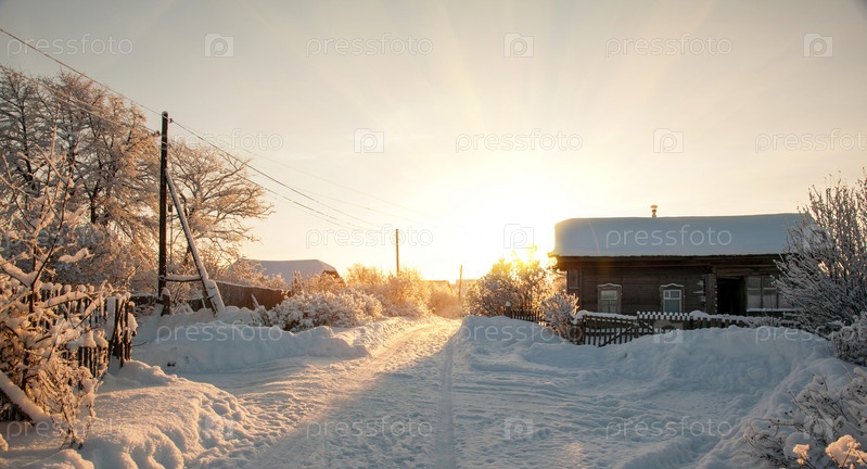 Деревенский дом в снегу и дорога