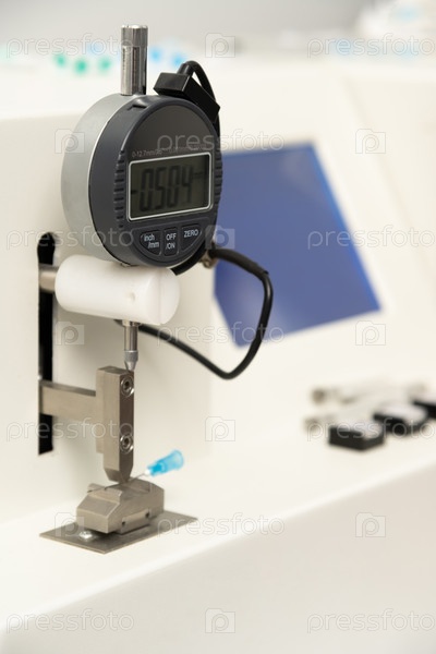 Вертикальный крупный план оборудования в медицинской лаборатории по производству медицинских шприцев