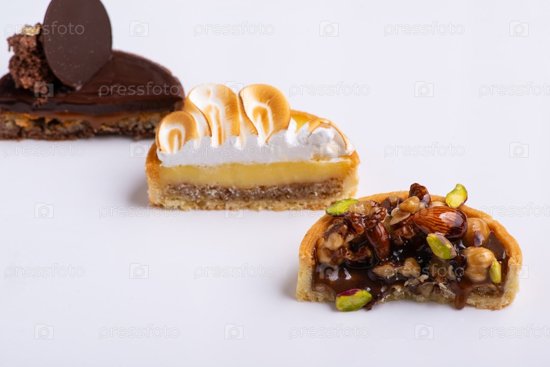 Три куска торта, разрезанные пополам на белом фоне