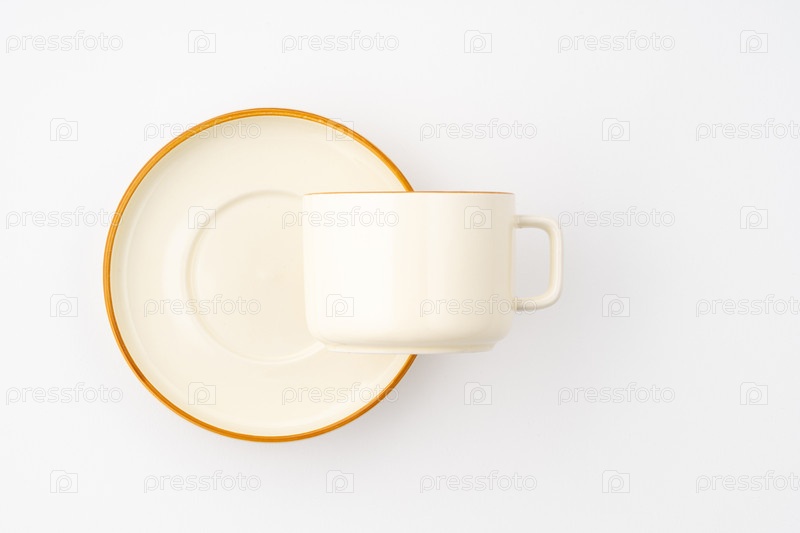 Набор белых и коричневых керамических тарелок и чашек на белом фоне. Вид сверху