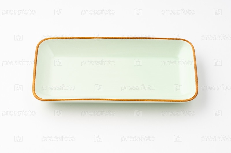 Одна керамическая зеленая прямоугольная тарелка на белом фоне