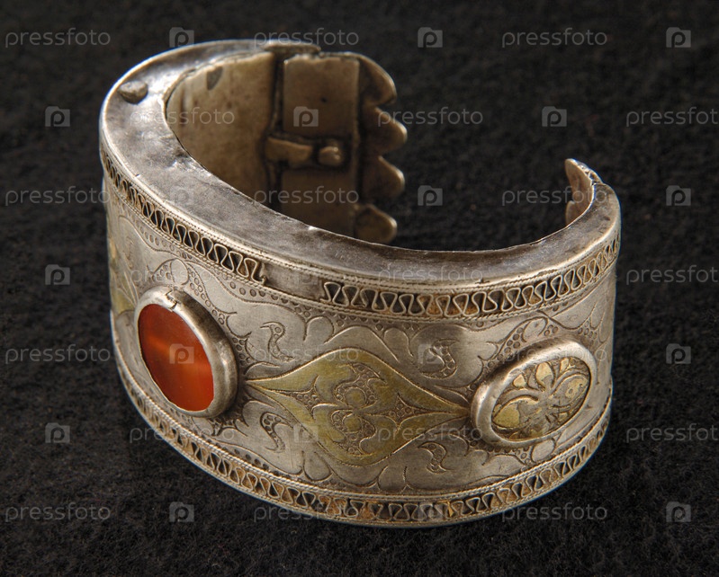 Старинный браслет с гравировкой и драгоценными камнями на черном фоне