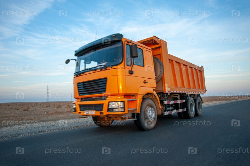 Оранжевый самосвал на пустынной дороге на фоне красивого неба