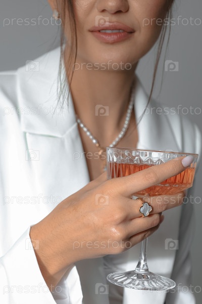 Стильная молодая женщина в современном белом блейзере с коктейльным бокалом в руке и кольцом на пальце