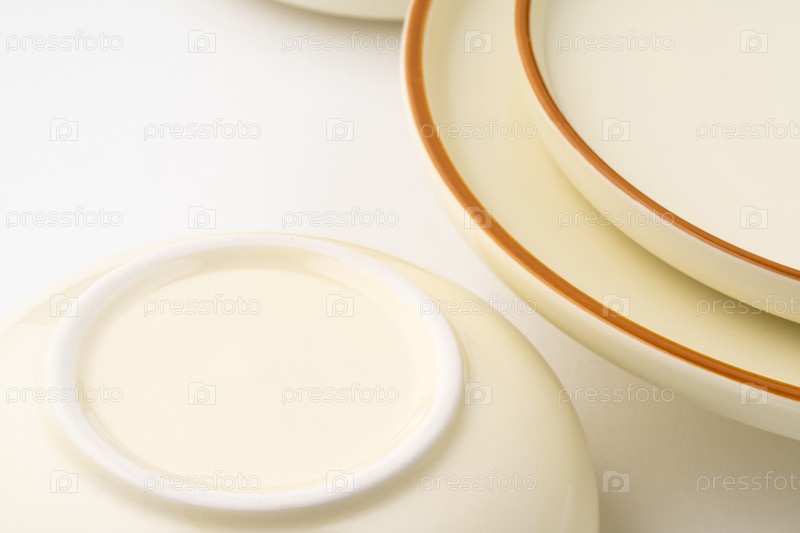Набор белой и коричневой керамической тарелки и миски на белом фоне