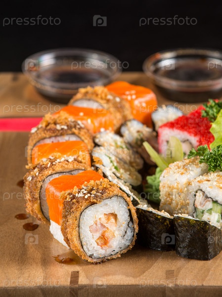 Крупный план суши на деревянной тарелке