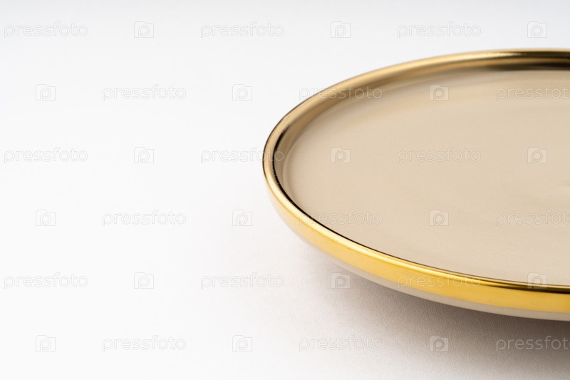 Светло-коричневая керамическая тарелка на белом фоне. Крупный план