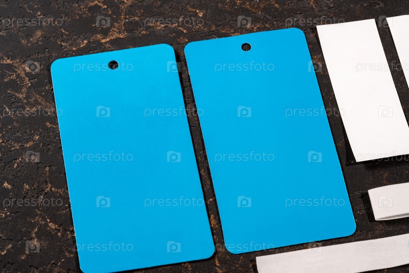 Крупный план пустых синих и белых бумажных бирок для продажи одежды