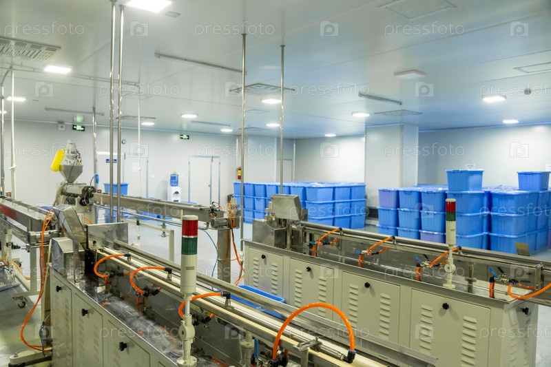Завод по производству медицинских шприцев и капельниц с оборудованием и синими контейнерами на заднем плане