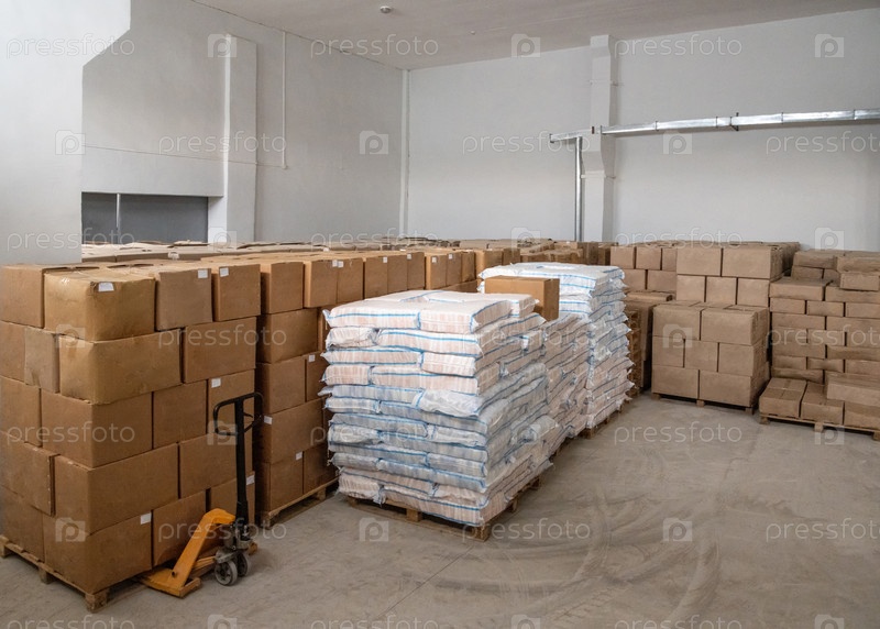 Куча ремесленных коробок и пакетов, сложенных друг на друга, и движущаяся тележка на белом складе