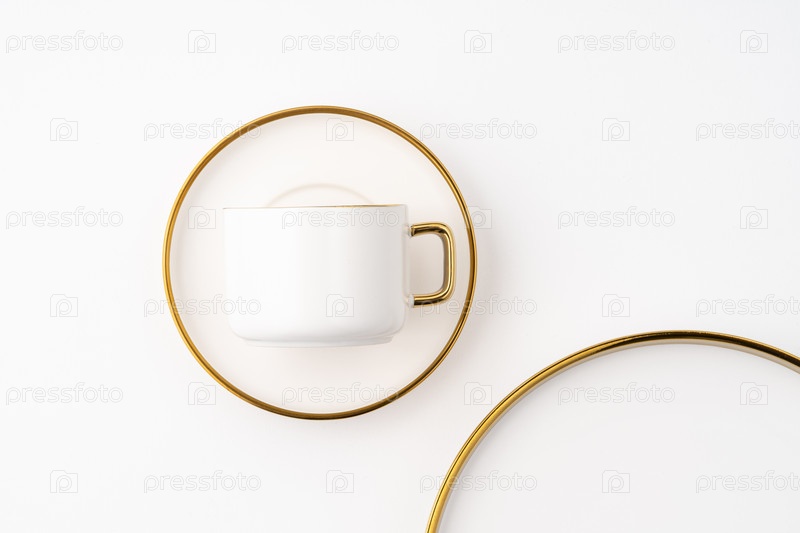 Набор белых и коричневых керамических тарелок и чашек на белом фоне. Вид сверху