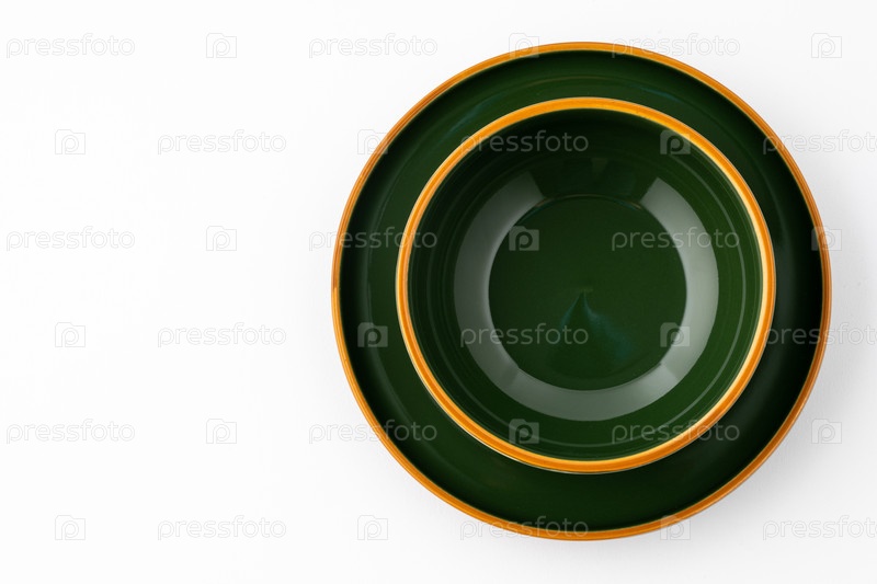 Набор темно-зеленой керамической посуды с оранжевыми очертаниями на белом фоне