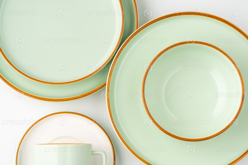 Набор белой и пастельно-зеленой керамической посуды с оранжевыми очертаниями. Вид сверху