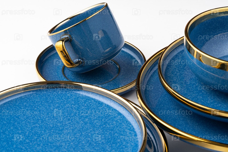 Набор синих керамических тарелок и чашки на белом фоне
