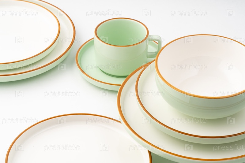 Набор керамической посуды на белом фоне