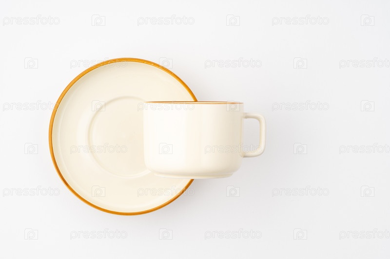 Набор белых и коричневых керамических тарелок и чашек на белом фоне. Вид сверху
