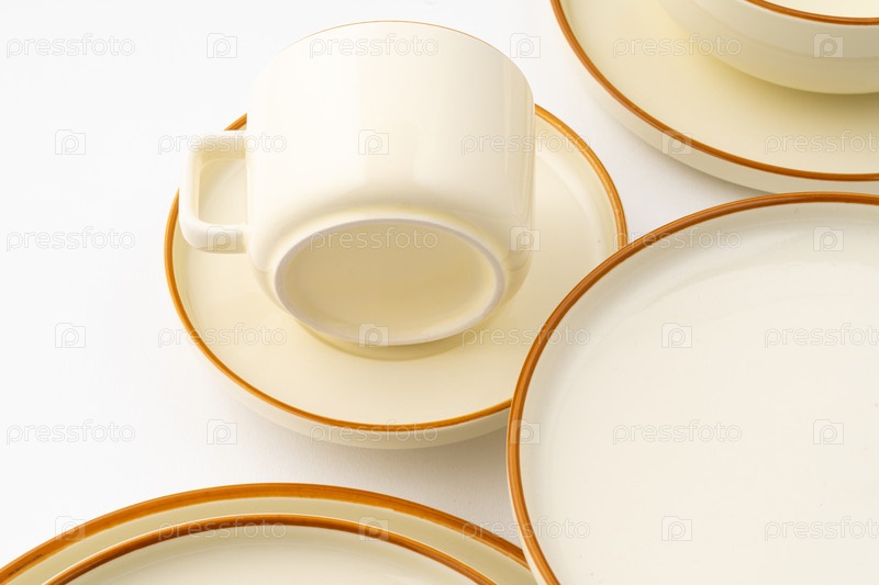 Набор белых и коричневых керамических тарелок и чашек на белом фоне