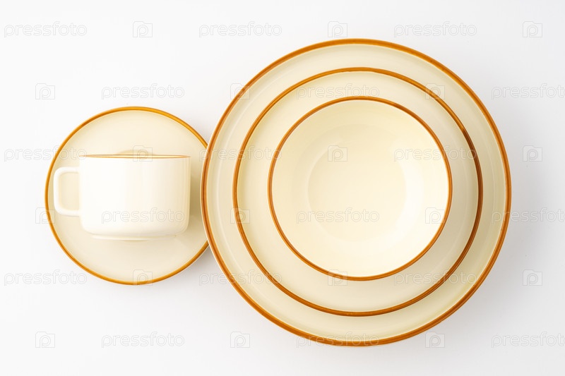 Набор белых и коричневых керамических тарелок и чашек на белом фоне. Вид сверху