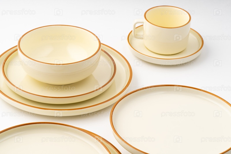 Набор белых и коричневых керамических тарелок и чашек на белом фоне