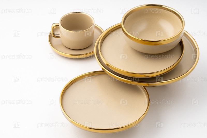 Набор светло-коричневой керамической тарелки и чашки на белом фоне