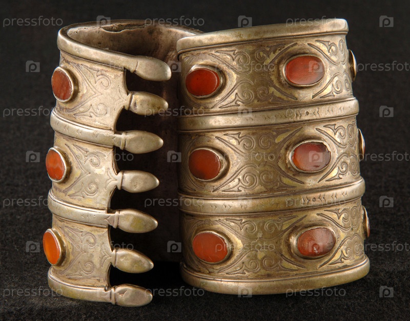 Старинные браслеты с гравировкой и драгоценными камнями на черном фоне