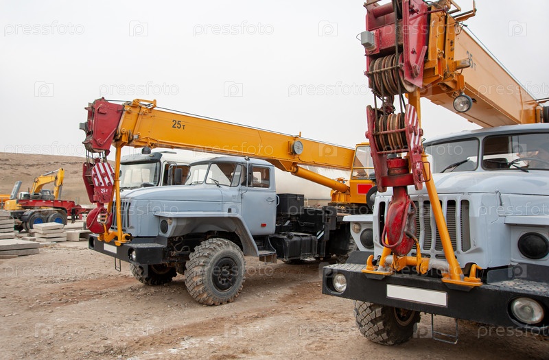 Ряд больших автокранов и машин на промышленной строительной площадке
