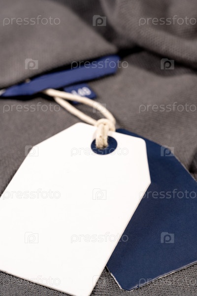 Вертикальный снимок крупным планом белых синих бирок на веревке на ткани