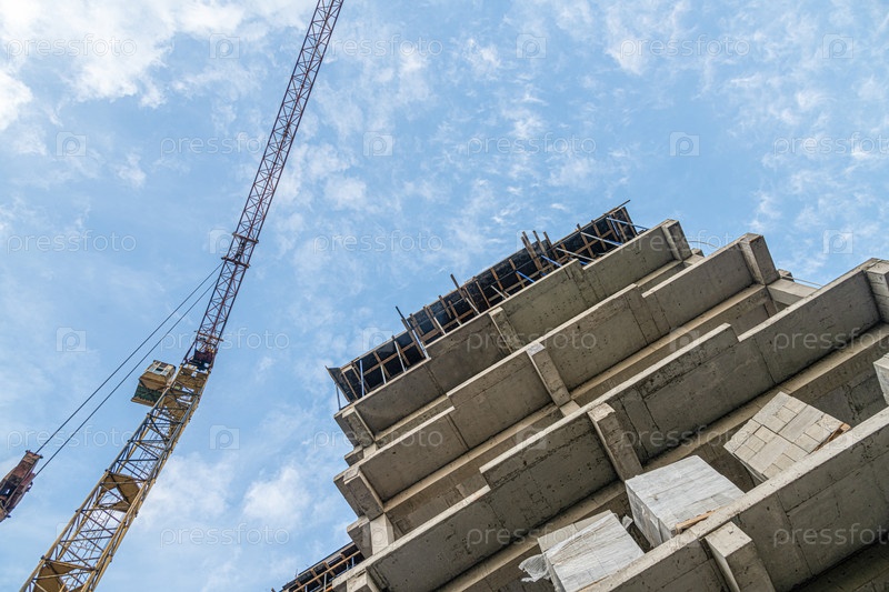 Низкоугольный снимок крана с оборудованием на строительной площадке рядом с новой строительной инфраструктурой