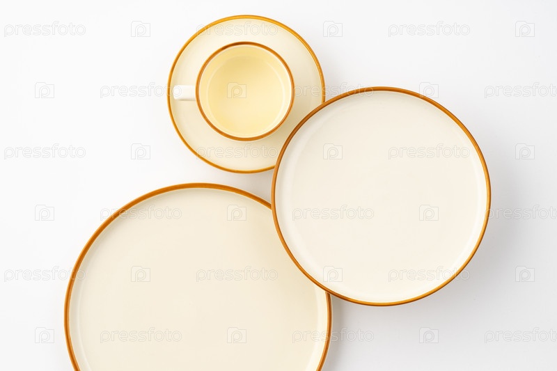 Набор белых и коричневых керамических тарелок и чашек на белом фоне. Вид сверху