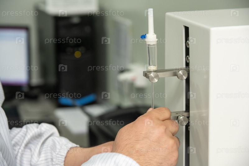 Крупный план рук, работающих на машине на складе медицинского производства шприцев