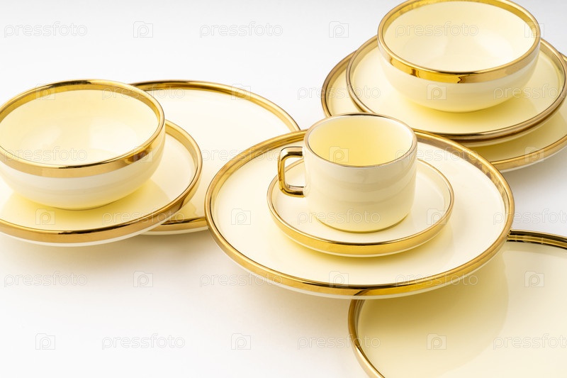 Набор золотой роскошной керамической кухонной утвари на белом фоне