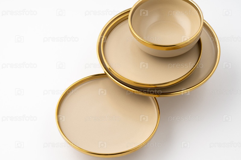 Набор светло-коричневой керамической тарелки и миски на белом фоне