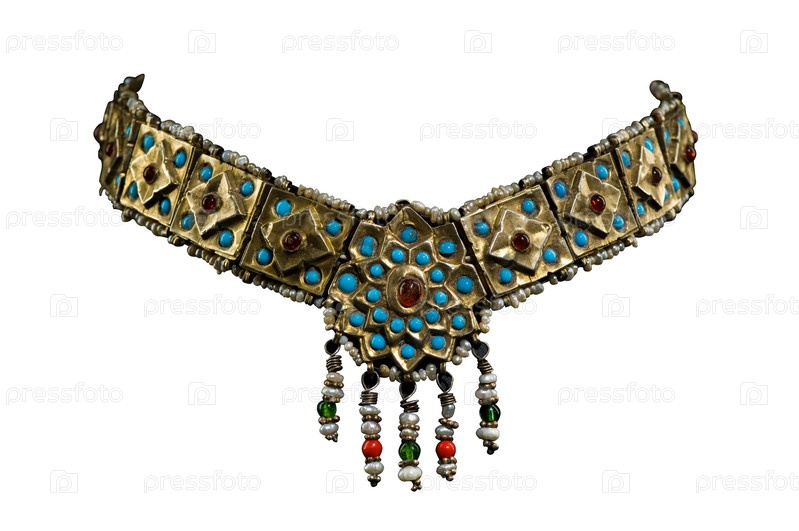 Индийский старинный ювелирный кулон с драгоценными камнями на белом фоне