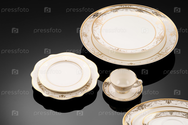 Роскошная посуда на черной отражающей поверхности