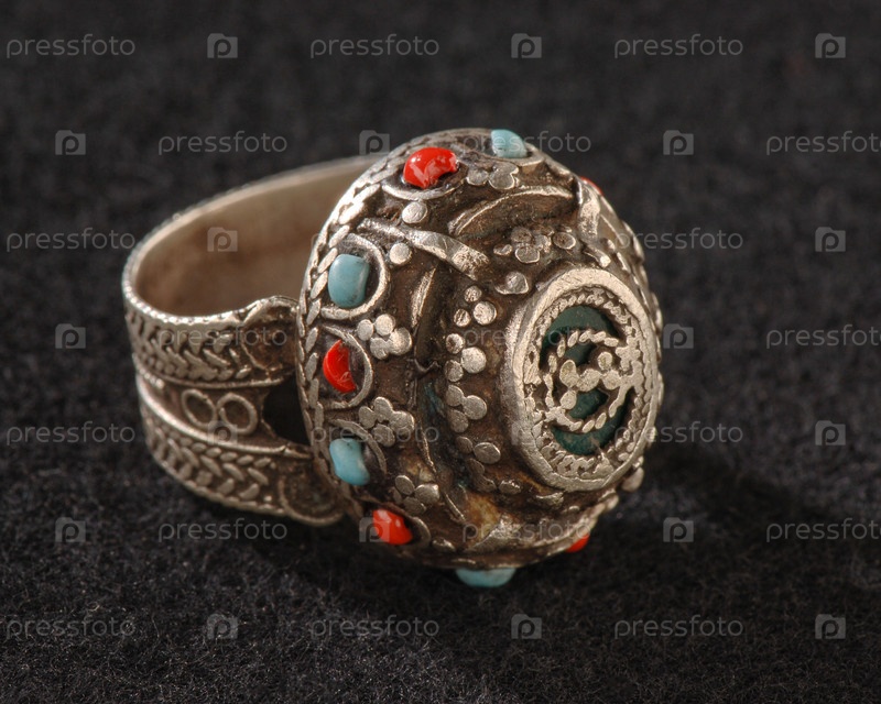 Винтажное модное кольцо с драгоценными разноцветными камнями на черном фоне