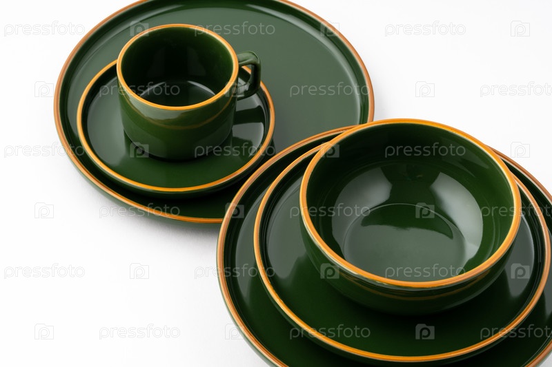 Набор темно-зеленой керамической посуды с оранжевыми очертаниями на белом фоне