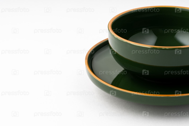 Набор зеленой керамической тарелки и кофейной кружки на белом фоне